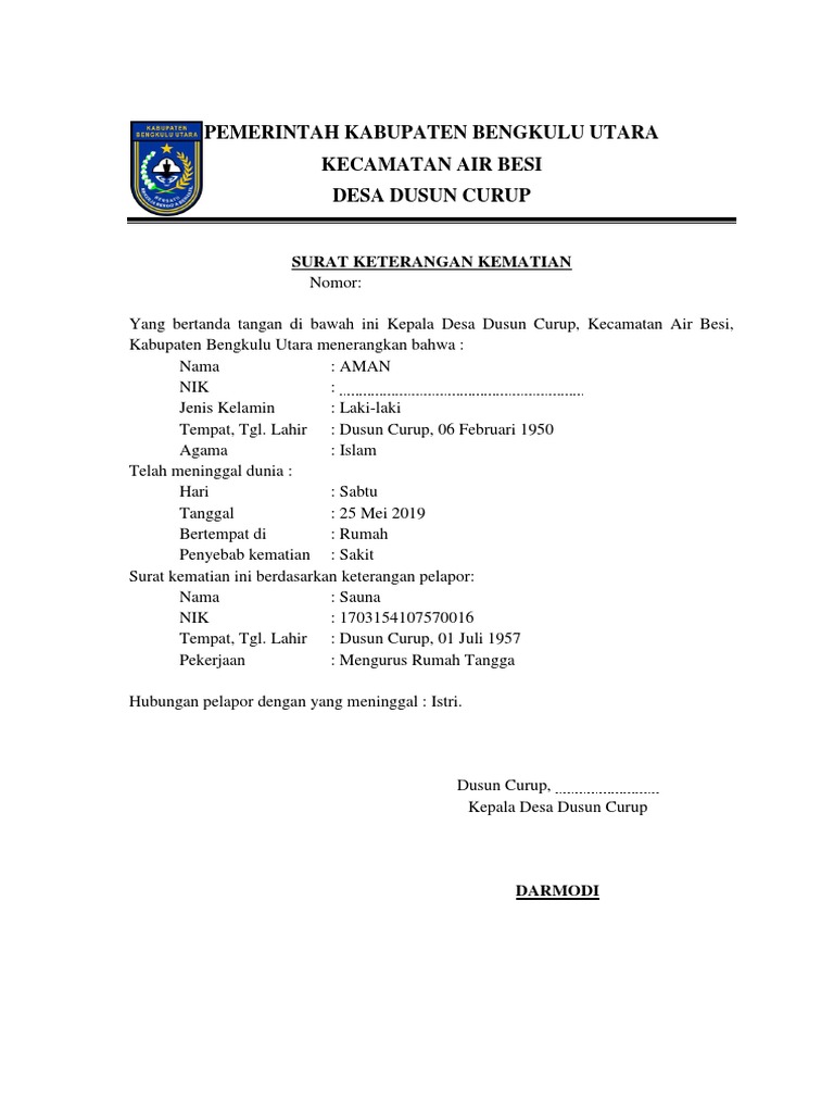 Contoh Surat Kematian Dari Desa 2019 ~ Mengurus Akta Kematian Di Kab Mojokerto Kini Dipermudah Desa Kemlagi Kecamatan Kemlagi Kabupaten Mojokerto Jawa Timur. Contoh surat jalan pengertian pengiriman barang. Ini wajib dimana bisa anda buat di rt anda jika tidak ada ataupun hilang misalnya anda bisa menggantinya dnegan surat laporan kematian dari kepolisian. Diatas adalah contoh surat pengunduran diri untuk kepala desa, kaur dan aparat desa atau staf kantor desa lainnya. Namun jika anda menulis surat permohonan rekomendasi atas nama pribadi atau perseorangan, maka mungkin anda hanya perlu. Geuchiek gampong, ( ) perhatikan format penulisan berikut ini untuk memudahkan anda